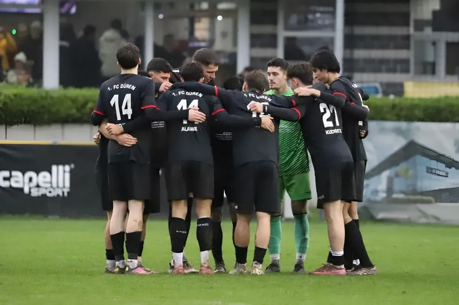 "Niemand erobert die Westkampfbahn" - besser konnte man es nach spannenden 90 Minuten gegen den SSV Bornheim nicht zusammen fassen. Unsere Mannschaft gab alles auf seifigem Untergrund und erkämpfte sich weitere Punkte für den Klassenerhalt. Doch zum Start sah es anders aus - schon nach 5 Minuten gingen die agilen Gäste in Führung. Ein denkbar schlechter Start, der unsere Mannschaft, in der Genki Myoshi für den gesperrten Eme Kongolo in die Startelf rückte, aber nicht wirklich schockierte. Schon 2 Minuten später schickte Jannis Kuckertz den schnellen Philipp Simon über links, der den Ball am Keeper vorbei schieben konnte. Das Spiel entwickelte sich zu einem offenen Schlagabtausch, in dem wir aber mehr vom Spiel hatten. Eine Hereingabe von Philipp Simon verlängerte Kapitän Nils Schütte auf den freien Ali Alawie, der sich nicht zweimal bitten ließ und zum 2:1 einnetzte (16.). Doch blieb es spannend, keine Minute später wackelte unser Gehäuse, einen Konter setzten die Bornheimer an Yannick Marko vorbei gegen den Pfosten. Aufatmen unter unseren Anhängern, die wieder Vollgas auf den Rängen gaben. Im Anschluss ließ unser Team einiges liegen, die Gäste lauerten. Mit dem 2:1 im Rücken und einem lautstarken "Düren, Düren!" ging es in die Pause.